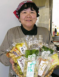 漬物のトレードマークはにっこり笑った「ふきちゃん漬」シールです。10年以上前から直売を始め、消費者の方から「すぐ食べられる加工品もほしい」という声を聞き、もともと料理が大好きなので、平成8年から漬物を作り始めました。