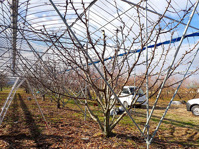 D 例年、霜害に遭いやすい園地のため、霜に当たりやすい目線から下の枝は、将来を見据え徐々に無くすように考えて、剪定しているとのことです。また、成り枝(果樹を成らせる枝)として残す枝も考慮しながら、剪定を進めます。