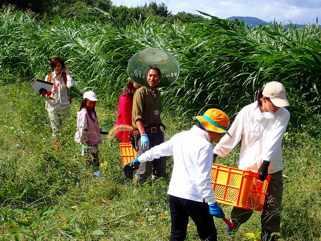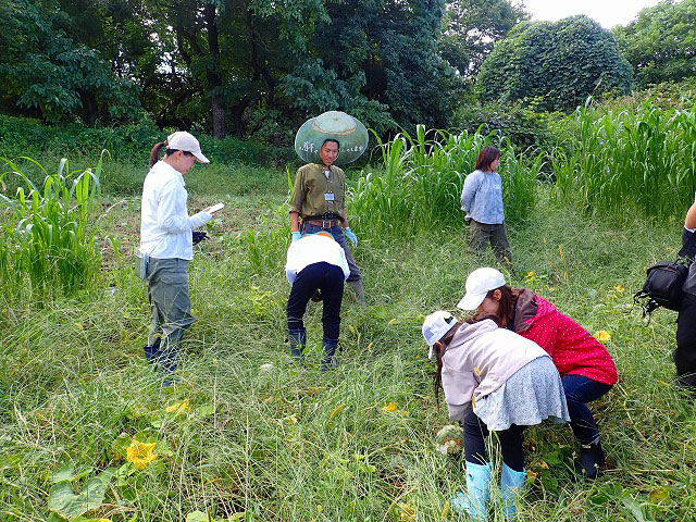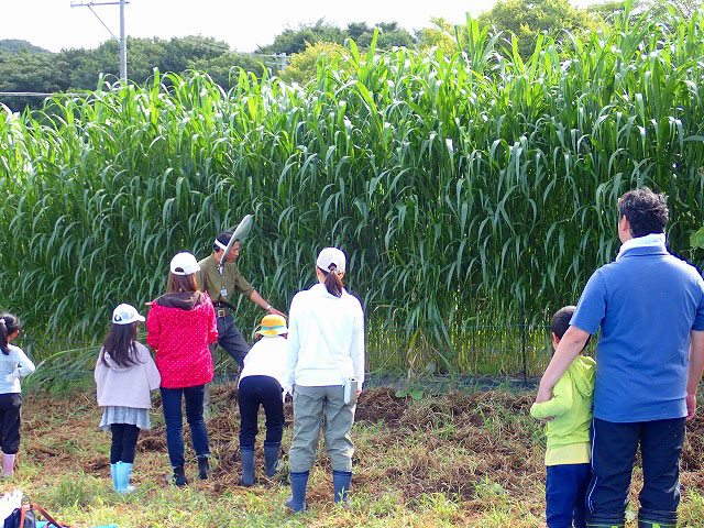 @ 畑の周りに植えた緑肥のソルガムは大きく成長し、畑の場所がわからないほどでした。実はこれは二ノ戸さんの作戦で、強い西日でかぼちゃが日焼けしないように、日よけの目的も兼ねているそうです。収穫後、ソルガムは畑にすき込まれ、緑肥の名のとおり土の養分になります。