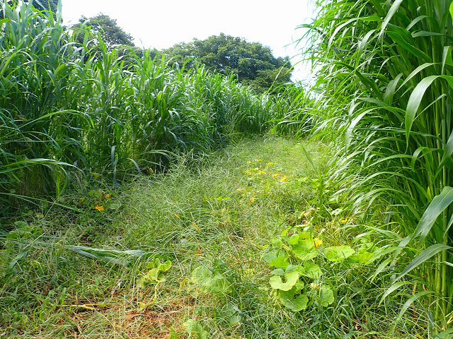 A 畑の中もまるで迷路のようですが、ソルガムの壁で畝がきれいに仕切られているのが分かります。かぼちゃの実を見つけるのは、まさに宝探しのよう。
