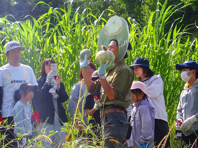 今年の“にのと農園”の蔵王かぼちゃの収穫は、厳しい暑さが和らぎ秋の気配を感じ始めた9月10日から始まりました。9月21日、山形市内の小学生親子を対象とした収穫体験イベントに伺いました。