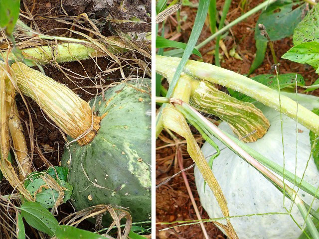 E 収穫の見極めポイントは、ヘタの色と硬さ。ヘタが緑色から茶色に変わり、乾燥して縦にひび割れができた状態(「コルク化」と呼ばれます)になると収穫適期です。左の写真が収穫適期、右の写真はもう少し成長が必要なかぼちゃです。