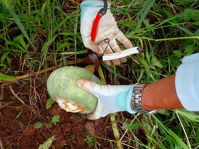 D 二ノ戸さんが、かぼちゃの収穫の方法や収穫適期の見極め方について説明します。