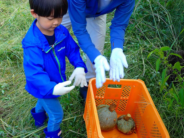 G 子どもたちは真剣に収穫適期のかぼちゃを探し、大切に収穫していました。
